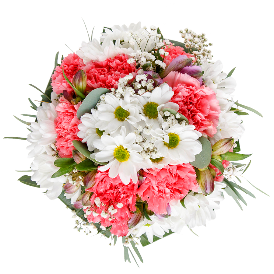 Experience the exquisite beauty of our hand-selected seasonal bouquet. This unique arrangement features a harmonious blend of snow-white chrysanthemums, delicate gypsophila, and soft light pink carnations, elegantly wrapped in lush aspidistra leaves.